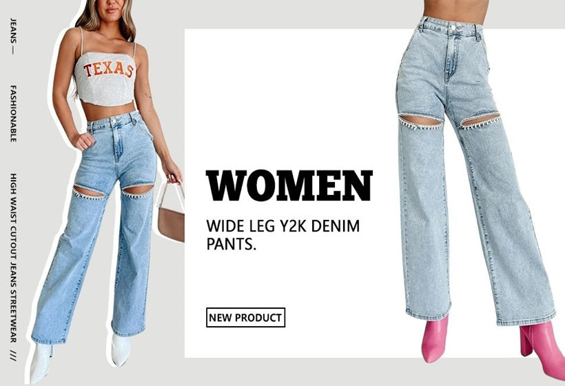 Women’s Sparkly Rhinestone Ripped Jeans Straight Wide Leg Diamond Denim Pants
