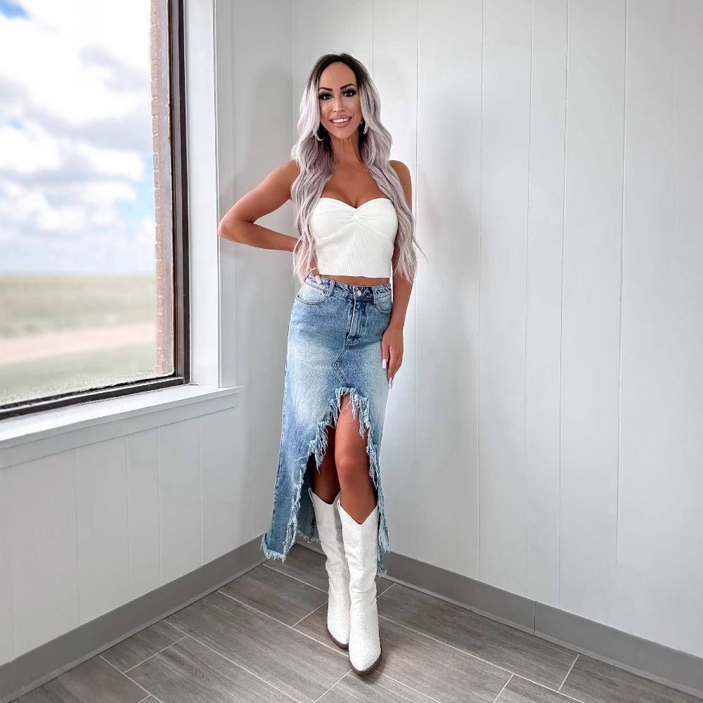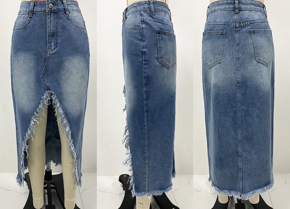 レディース スリット デニム ジーンズ スカート ハイウエスト ほつれ ボタンアップ ロングスカート