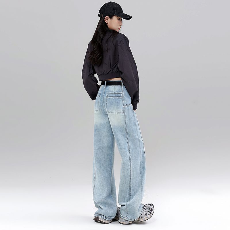 High Waist Curved Hem Straight Wide Leg Jeans Women Y2K Baggy Denim Trousers